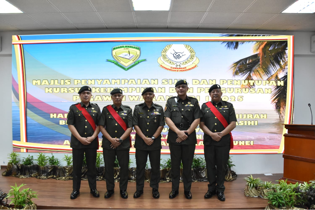 PENANJONG GARISON, Jumaat, 19 September 2025 – Majlis Penyampaian Sijil dan Penutup bagi Kursus Kepimpinan dan Pengurusan Pegawai Waran Siri 1/2025 telah diadakan di Bilik Halbi, Pusat Evolusi Institut Latihan, Angkatan Bersenjata Diraja Brunei (IL ABDB). Hadir selaku Tetamu Kehormat ialah Yang Mulia Leftenan Kolonel Mohammad Fakaruddin Zuraidie bin Haji Ramli, Pemangku Komandan IL ABDB. Turut hadir ialah Pegawai-pegawai IL ABDB, Pegawai-pegawai jemputan, Sarjan Mejar ABDB, PTB-PTB Kanan dan Jurulatih-jurulatih Cawangan Kepimpinan dan Pengurusan, Pusat Evolusi IL ABDB.