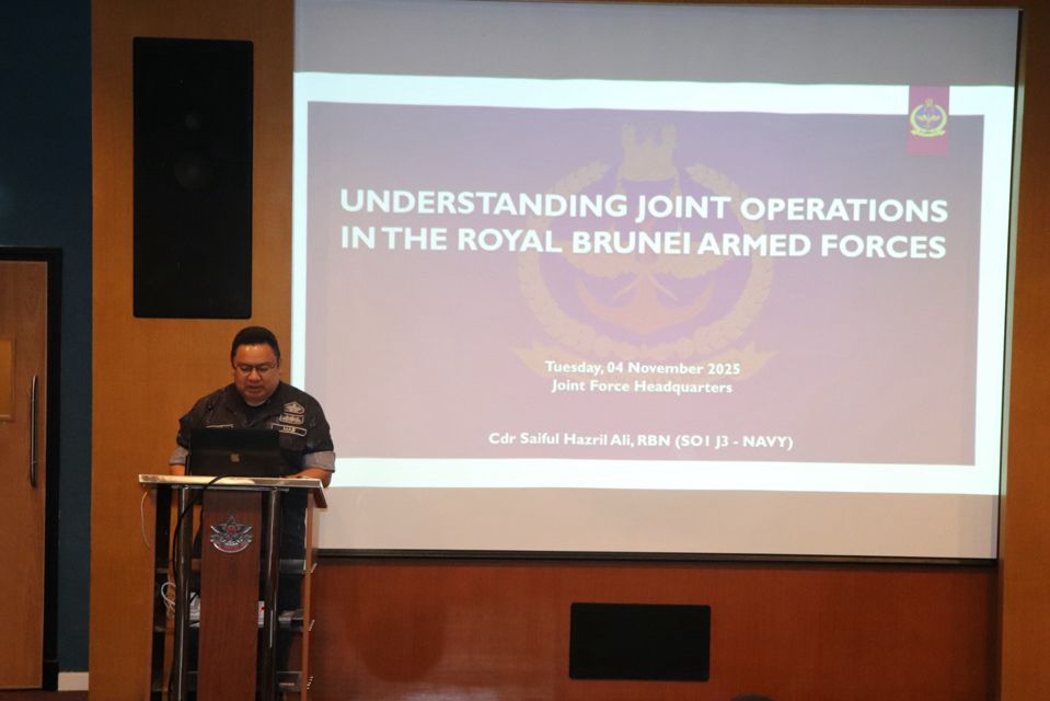 BOLKIAH GARRISON, Tuesday, 04 November 2025 – The Joint Force Headquarters, Royal Brunei Armed Forces (JFHQ RBAF), received a study visit from participants of the Maritime Operations (MAROPS) Course Serial 08/2025. The visiting group comprised 11 officers and one Directing Staff member from the Royal Brunei Navy (RBN). They were received and given a presentation by Commander Saiful Hazril Mohd Ali, RBN, who serves as the Staff Officer J3 Navy, JFHQ.